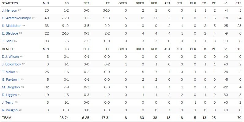 Ο Έλληνας διεθνής άσος σκόραρε 24 πόντους και μάζεψε 17 ριμπάουντ σε μία στατιστική που συνοδεύτηκε ακόμη από δύο ασίστ, τρία κλεψίματα, ισάριθμα λάθη σε 40 λεπτά συμμετοχής. Μοναδικό στήριγμα στον πρώτο υπήρξε ο Κρις Μίντλετον με 23 πόντους