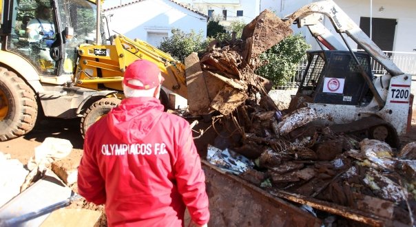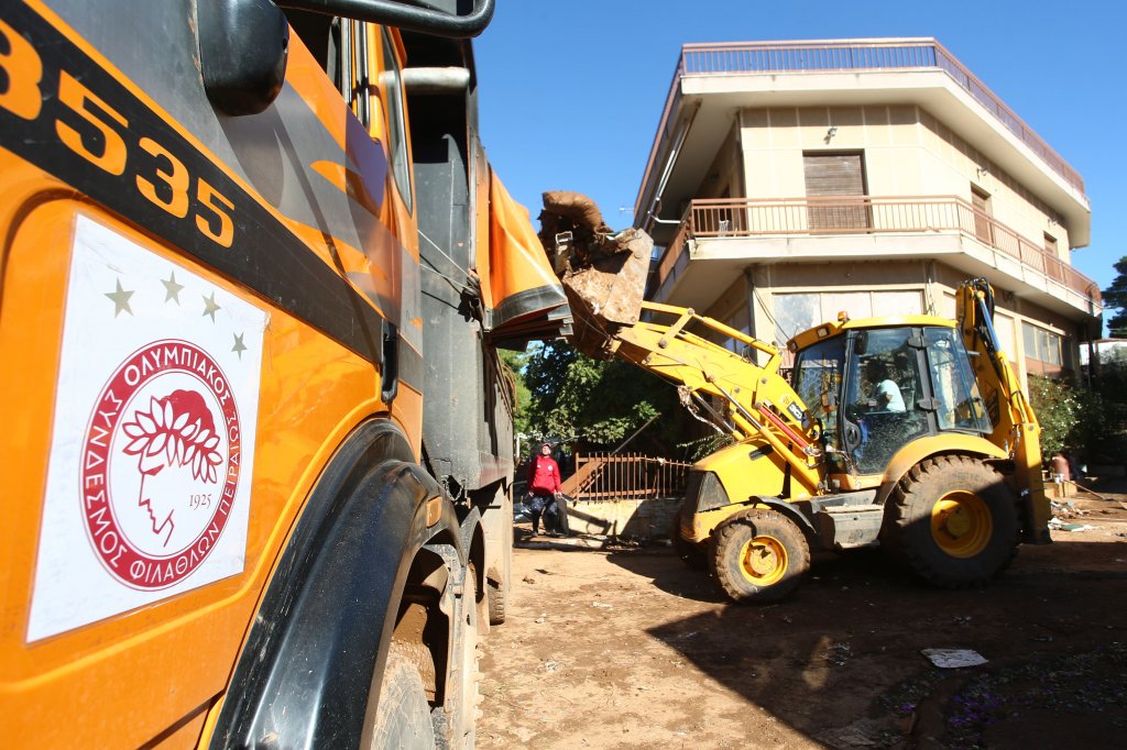 Τα μηχανήματα που έχει διαθέσει ο Ολυμπιακός, bobcat, φορτηγά, υδροφόρες (μαζί με εκείνες του Δήμου Πειραιά και του Δήμου Μοσχάτου-Ταύρου), συνέχισαν να δουλεύουν και σήμερα πυρετωδώς, καθαρίζοντας σπίτια, αυλές, πεζοδρόμια, δρόμους και προαύλια σε εκκλησίες, σχολεία, όπου υπάρχει ανάγκη, από τις λάσπες, τις οποίες έφεραν οι φονικές πλημμύρες.