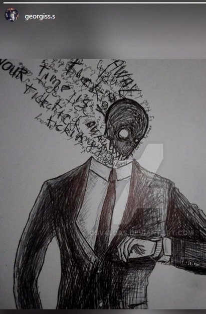 Συγκεκριμένα, ο γιος του ισχυρού άνδρα της ΠΑΕ ανέβασε ένα σκίτσο με μία κοστουμαρισμένη φιγούρα που δείχνει να τρώει τη σάρκα της κοιτώντας το ρολόι.