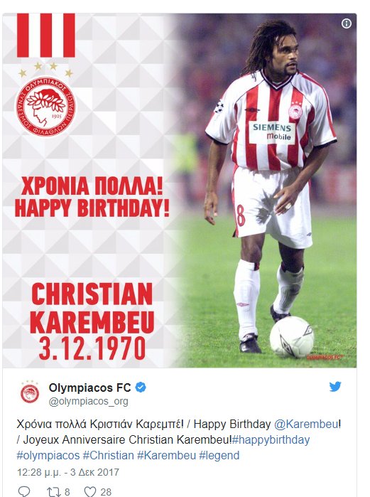 Ο σύμβουλος στρατηγικής της ΠΑΕ Ολυμπιακός κλείνει τα 47 του χρόνια και οι «ερυθρόλευκοι» του ευχήθηκαν «χρόνια πολλά» μέσω socialmedia.