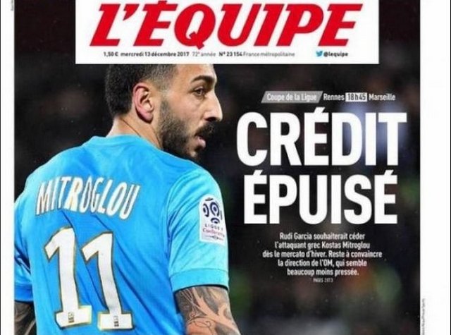 Η κριτική που ασκείται στον Κώστα Μήτρογλου είναι σφοδρή και στο πρωτοσέλιδο της Τετάρτης (13/12) η «Equipe» αναφέρει πως ο διεθνής επιθετικός θα αποτελέσει παρελθόν από τους Μασσαλούς τον Ιανουάριο.