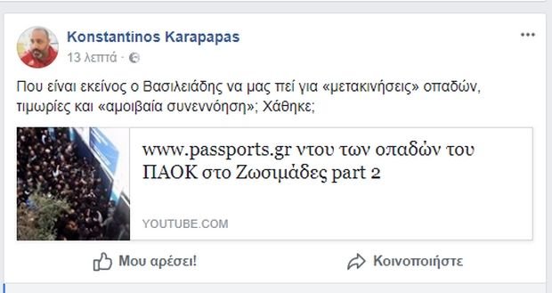 Φυσικά, το περιστατικό δεν έμεινε ασχολίαστο από τον Κώστα Καραπαπά ο οποίος τοποθετήθηκε μέσω social media.