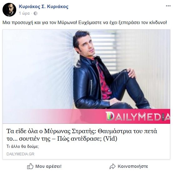 «Μια προσευχή και για τον Μύρωνα! Ευχόμαστε να έχει ξεπεράσει τον κίνδυνο!», έγραψε, με προφανή αναφορά στο «PrayForOscar» που είχε βάλει νωρίτερα η ΠΑΕ.