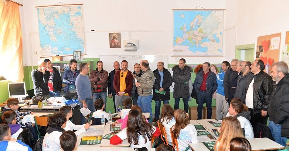Αναστασιάδης, Παντελιάδης και Μπλάζιτς, λοιπόν, παρέα με το τεχνικό τιμ επισκέφθηκαν το 4ο Δημοτικό Σχολείο της πόλης της Φθιώτιδας, στο πλαίσιο του εγκεκριμένου από το υπουργείο Παιδείας προγράμματος της ΕΠΟ «Πάσα στα θρανία» για τη διάδοση των αξιών του αθλήματος.