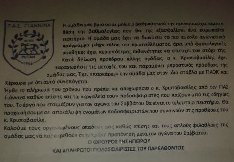«Έχει “παρκάρει” την ομάδα μας στον ίδιο στάβλο με ΠΑΟΚ και Κέρκυρα με ότι αυτό συνεπάγεται» αναφέρεται χαρακτηριστικά. Οι συντάκτες της προκήρυξης ζητούν από τον Γιώργο Χριστοβασίλη να αποχωρήσει από την ομάδα ενώ γίνεται κάλεσμα στους οπαδούς της ομάδας σε συγκέντρωση στην προπόνηση του ΠΑΣ αμέσως μετά τον αγώνα με την Κέρκυρα!