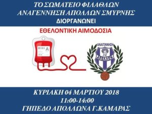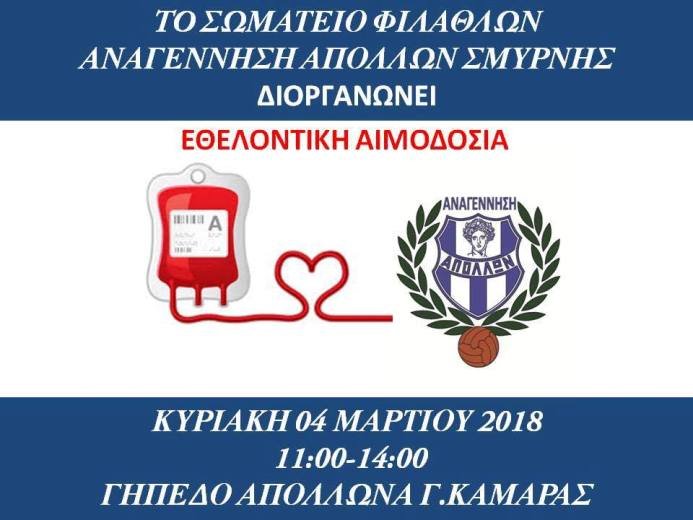 Η αιμοδοσία πραγματοποιείται για ένατη συνεχή χρονιά και αποτελεί τον πλέον περήφανο και πραγματικά αναγκαίο θεσμό της οικογένειας του Απόλλωνα, αφού περισσότερες από 150 μπουκάλες αίματος έχουν δοθεί τα τελευταία χρόνια σε συνανθρώπους μας.