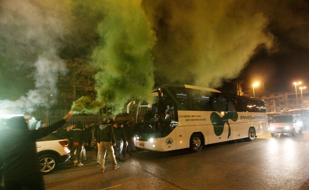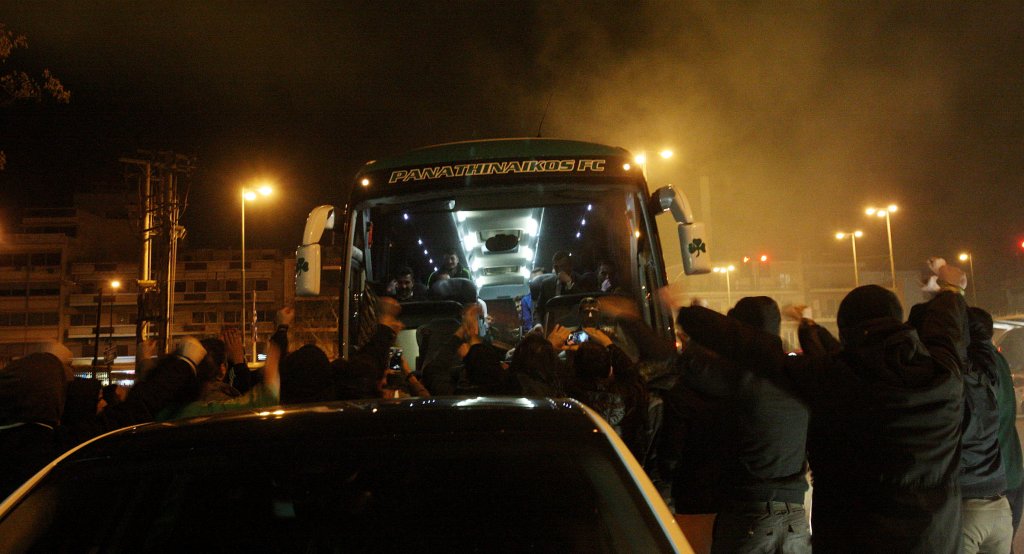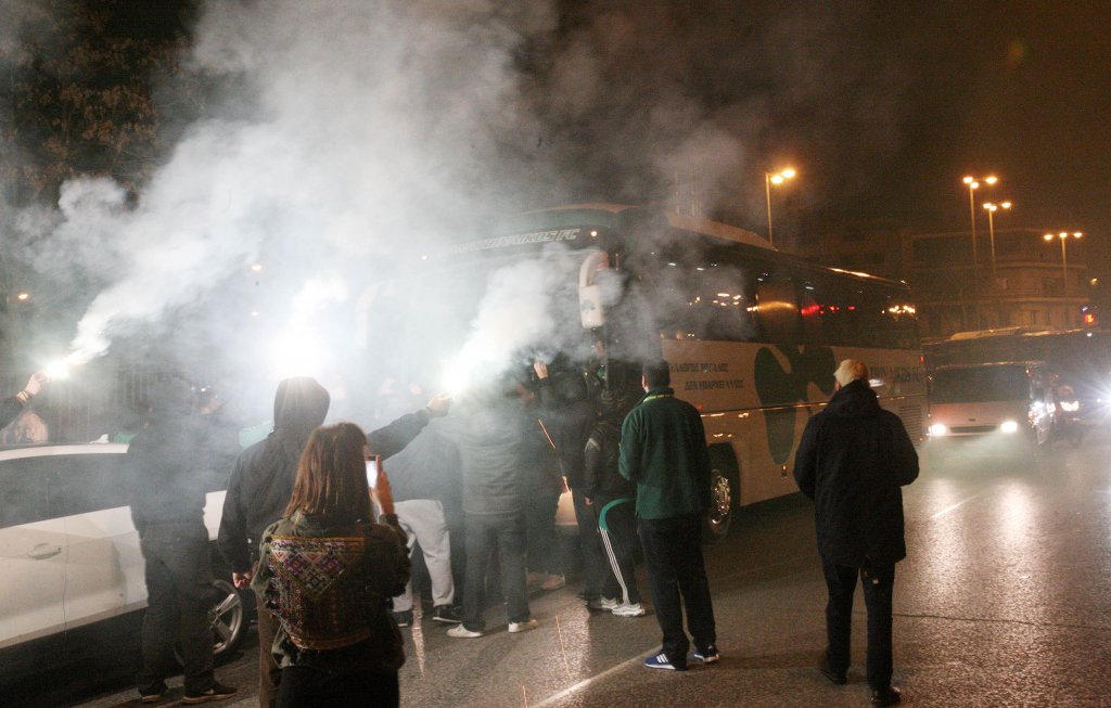 Όταν λοιπόν το πούλμαν έκανε την εμφάνισή του, το σταμάτησαν, αποθεώνοντας τον Μαρίνο Ουζουνίδη και τους παίκτες του. Φώναξαν συνθήματα, άναψαν πυρσούς ενώ κάποιοι μπήκαν και μέσα, δίνοντάς τους συγχαρητήρια για την εμφάνισή τους.