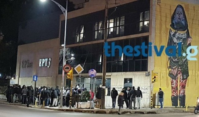 Στη συνέχεια, εισέβαλαν στο στούντιο του τρίτου καναλιού της κρατικής τηλεόρασης, διέκοψαν το δελτίο ειδήσεων, πέταξαν φέιγ βολάν κατά της Νέας Δημοκρατίας και του ΣΥΡΙΖΑ, παρέδωσαν ψήφισμα διαμαρτυρίας και αφού συνομίλησαν με στελέχη του αθλητικού τμήματος, αποχώρησαν.