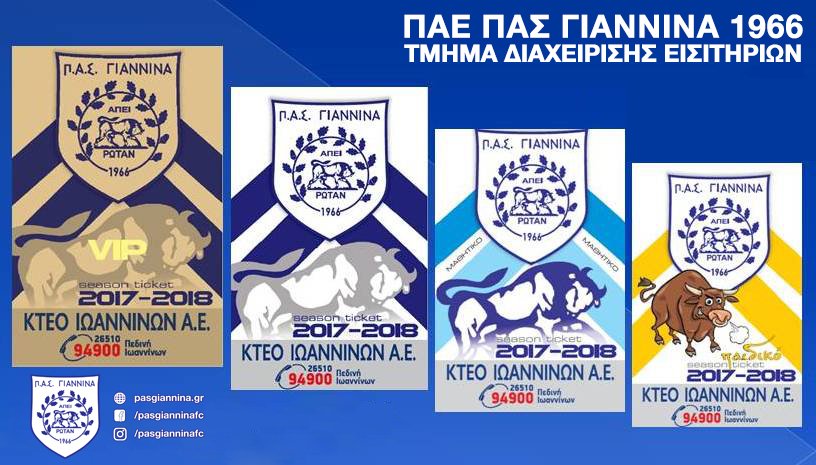 Οι φίλοι της ομάδας μας μπορούν να προμηθεύονται τα εισιτήρια τους για τον αγώνα με τον Απόλλωνα Σμύρνης τη Δευτέρα 12, Μαρτίου 2018, 19:30, από τα γραφεία της ΠΑΕ ΠΑΣ ΓΙΑΝΝΙΝΑ στο ΠΕΑΚΙ Ανατολής από σήμερα Τετάρτη έως και το Σάββατο και τη Δευτέρα του αγώνα από τα εκδοτήρια στο ΕΣΙ «οι ΖΩΣΙΜΑΔΕΣ».
