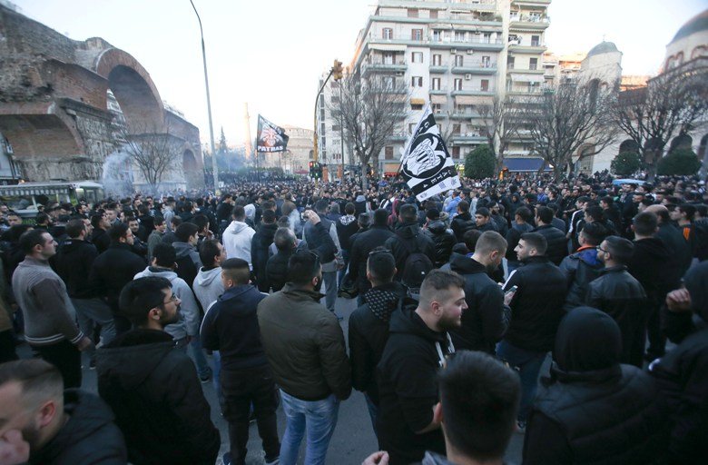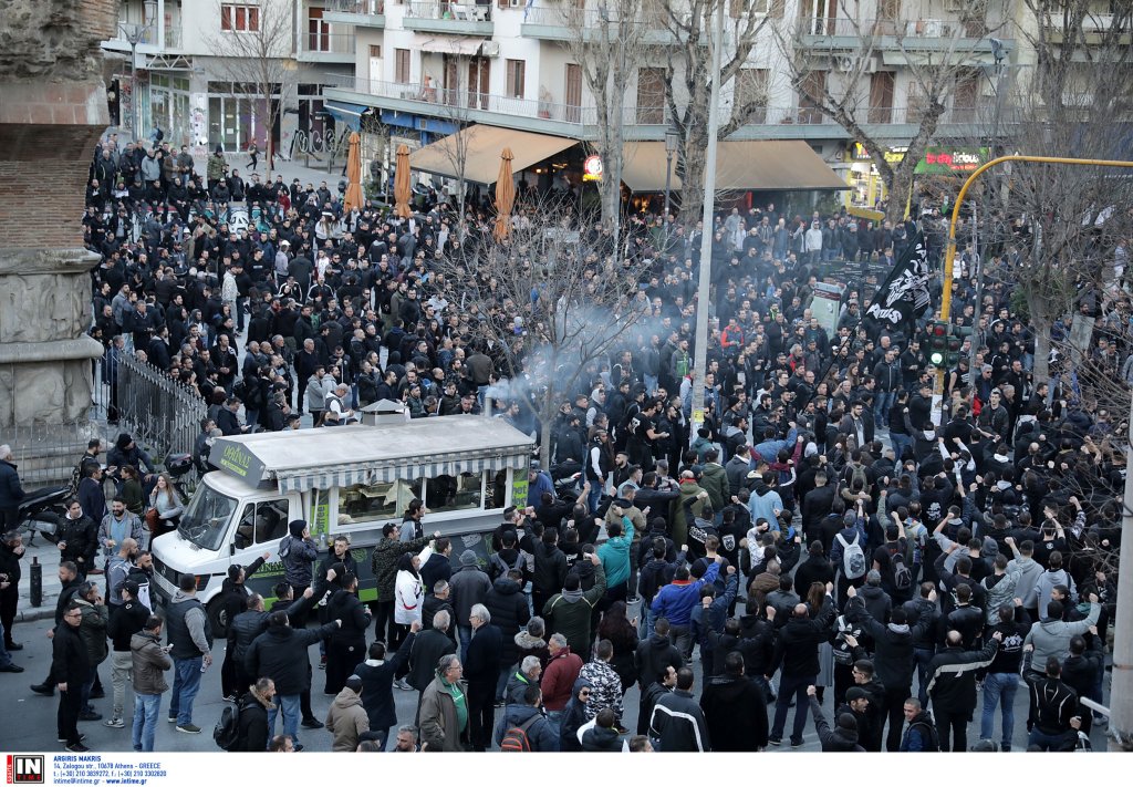 Από τις 18:00 της Πέμπτης (8/3) αρκετοί οπαδοί του «Δικεφάλου του Βορρά» άρχισαν να συγκεντρώνονται στην πλατεία Καμάρας, φωνάζοντας συνθήματα με στόχο την αθώωση της ομάδας τους. Λίγο αργότερα ξεκίνησε η πορεία διαμαρτυρίας τους με προορισμό την Αριστοτέλους, με τον όγκο τους να εκτιμάται στους 4.000.