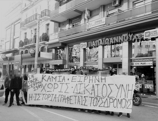 Οπαδοί του ΠΑΟΚ λοιπόν, πραγματοποίησαν παρέμβαση στα γραφεία του ΣΥΡΙΖΑ και στο δημαρχείο της πόλης με πανό που έγραφαν «Καμιά ειρήνη χωρίς δικαιοσύνη. Η ιστορία γράφεται στους δρόμους…»