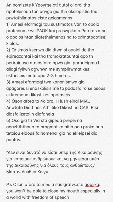 Αναλυτικά η ανάρτησή του: «Αν νομίζετε κ.Υπουργέ ότι αυτοί οι όροι θα αποτελέσουν τον αρωγό για την αξιοπιστία του πρωταθλήματος είστε γελασμένος.