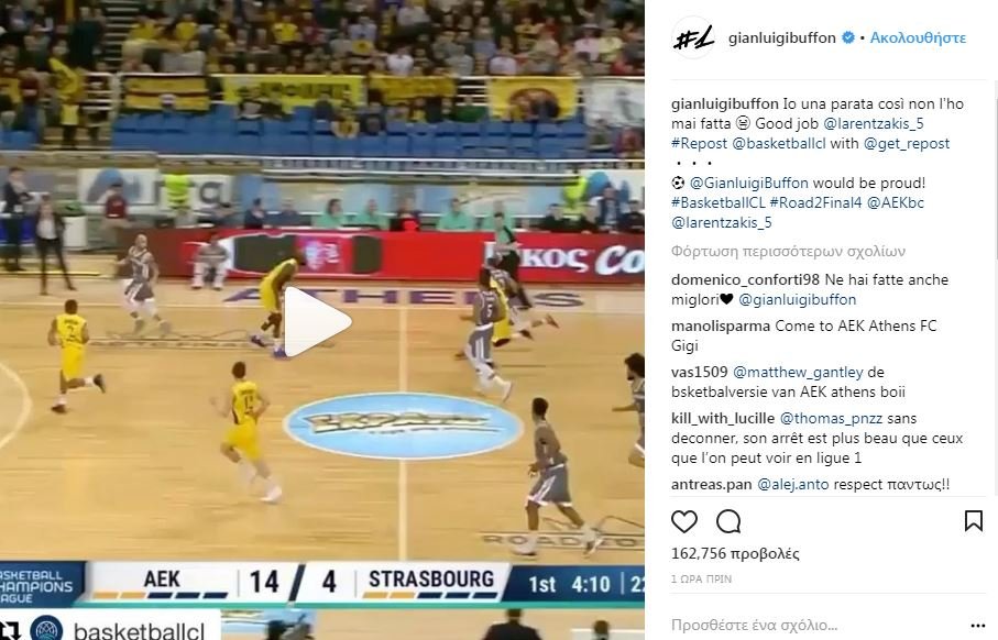 Ο Ιταλός τερματοφύλακας είδε το στιγμιότυπο και αποθέωσε τον 24χρονο άσο της ΑΕΚ στην προσωπική του σελίδα στο instagram κάνοντας repostτην ανάρτηση από την σελίδα του Τσάμπιονς Λιγκ.