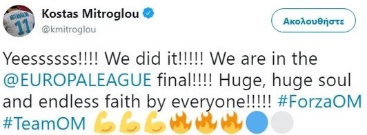 «Ναιαιααιαιαι! Τα καταφέραμε!!! Είμαστε στον τελικό του Γιουρόπα Λιγκ!!! Tεράστια, τεράστια ψυχή και ατελείωτη πίστη από όλους!!! Ζήτω η Μαρσέιγ», έγραψε χαρακτηριστικά.