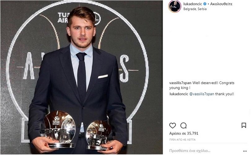 Ο Λούκα Ντόντσιτς τιμήθηκε με το βραβείο του MVP της φετινής Ευρωλίγκας και ένα από τα μηνύματα που δέχθηκε για συγχαρητήρια ήταν από τον Βασίλη Σπανούλη.