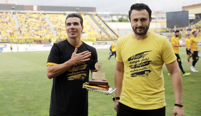 Στο παιχνίδι του Άρη με τον Πανσερραϊκό, το απόγευμα της Κυριακής (20/5), για την 33η αγωνιστική της Β’ Εθνικής, φόρεσε για 152η φορά τη φανέλα των «κίτρινων» σε αγώνα πρωταθλήματος (έχει ακόμη 21 παιχνίδια στο Κύπελλο Ελλάδας και 13 στην Ευρώπη) και γνώρισε την αποθέωση.