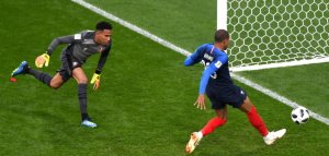 Το Περού μπήκε δυνατά, αλλά η Γαλλία από το 10’ και μετά πήρε τον έλεγχο… Σιγά σιγά άρχισε να δημιουργεί φάσεις στα αντίπαλα καρέ και φαινόταν πως αργά ή γρήγορα το γκολ θα ερχόταν. Αυτό τελικά ήρθε στο 34’ όταν μετά από σουτ του Ζιρού και κόντρα του Ροντρίγκες ο Εμπαπέ δεν άφησε ανεκμετάλλευτο το «δώρο» και με πλασέ σε κενή εστία σχεδόν εξ επαφής έστειλε την μπάλα στα δίχτυα.