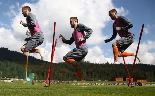 Πολύ... ιδρώτα ρίχνουν από νωρίς στο Ζέεφελντ οι παίκτες του Ολυμπιακού. Η πρωινή προπόνηση της Τετάρτης (27/6) ήταν μεγάλη σε διάρκεια και είχε ιδιαίτερη ένταση, καθώς, πέραν του ζεστάματος στο ξεκίνημα, οι άλλες ασκήσεις εκτελούνταν... στα κόκκινα.