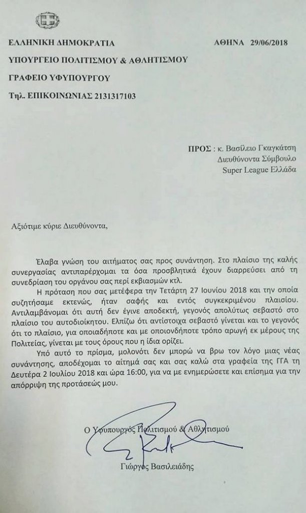 Ελπίζω ότι αντίστοιχα σεβαστό γίνεται και το γεγονός ότι το πλαίσιο, για οποιαδήποτε και με οποιονδήποτε τρόπο αρωγή εκ μέρους της Πολιτείας, γίνεται με τους όρους που η ίδια ορίζει. Υπό αυτό το πρίσμα μολονότι δεν μπορώ να βρω το λόγο μιας νέας συνάντησης, αποδέχομαι το αίτημα σας και σας καλώ στα γραφεία της ΓΓΑ τη Δευτέρα 2 Ιουλίου 2018 και ώρα 16.00 για να με ενημερώσετε και επίσημα για την απόρριψη της προτάσεως μου».