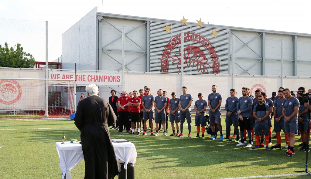 Ο πατέρας Δημήτριος ήταν αυτός που τέλεσε τον αγιασμό και ευχήθηκε τα καλύτερα στους Πειραιώτες, αρχής γενομένης από τα προκριματικά για το Γιουρόπα Λιγκ, όπως βέβαια υγεία και ψυχική δύναμη.