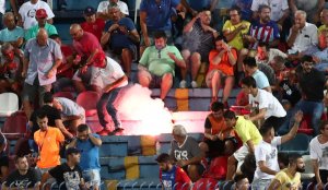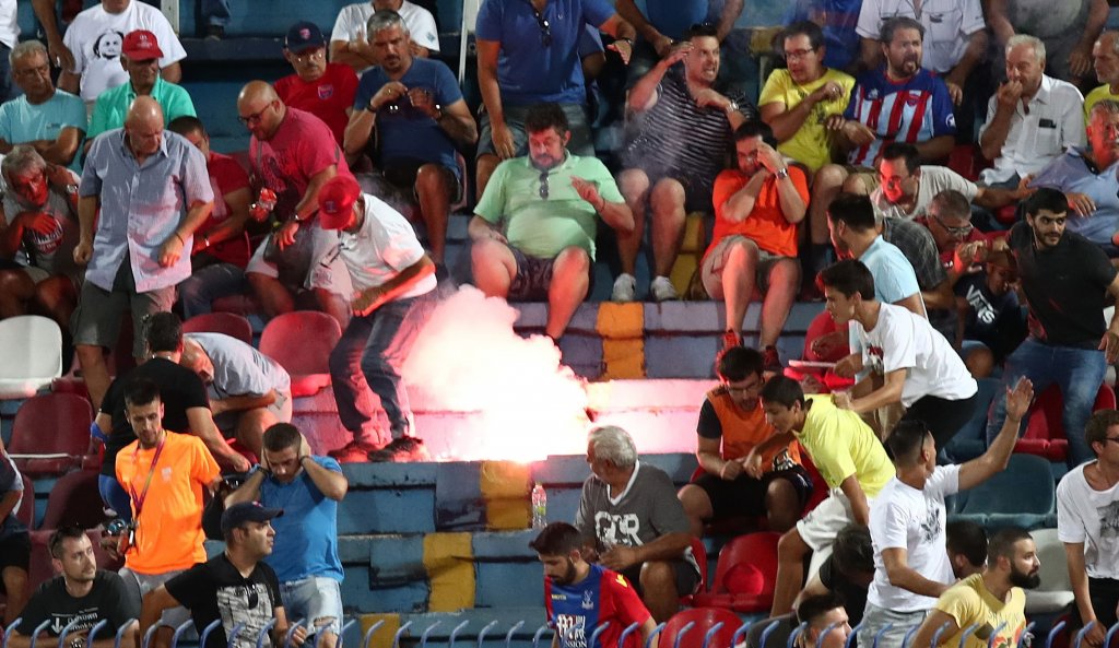 Βίντεο έχει καταγράψει τη σκηνή και την αναστάτωση που ακολούθησε, με πολλούς να ζητούν εκείνη την ώρα τη διακοπή του ματς, αποδοκιμάζοντας.
