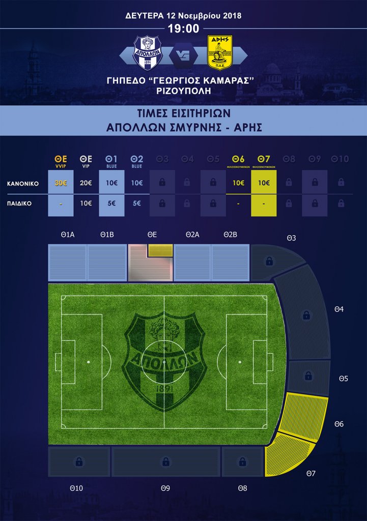Για τους φιλάθλους του Άρη που μεμονωμένα θα βρεθούν στο γήπεδο Γεώργιος Καμάρας θα διατίθενται εισιτήρια στη Θύρα 6-7 με τιμή 10,00€. Εκδοτήριο εισιτηρίων για τη Θύρα 6-7 θα λειτουργεί έξω από την Θύρα 3».