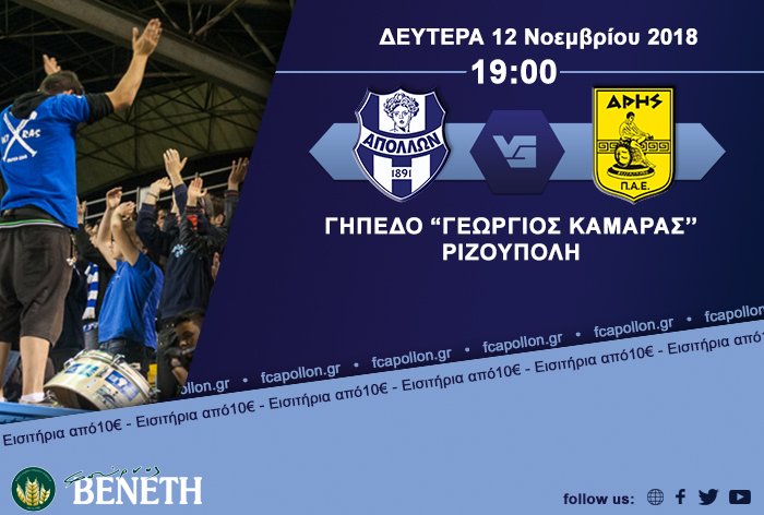 Αναλυτικά η ενημέρωση: «Για τη διευκόλυνση όσων θέλουν να παρακολουθήσουν τον εντός έδρας αγώνα της ομάδας μας με αντίπαλο τον Άρη, (Δευτέρα, 12/11/2018, 19:00) για την 10η αγωνιστική ημέρα, του πρωταθλήματος της Super League, στο γήπεδο “Γεώργιος Καμάρας”, η ΠΑΕ Απόλλων Σμύρνης ενημερώνει: