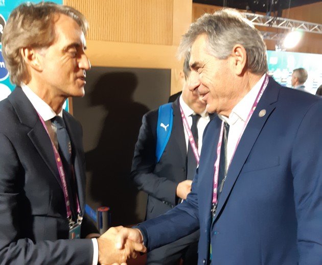 Μάλιστα, είχε και μια ολιγόλεπτη συζήτηση για το αποτέλεσμα της κλήρωσης με τον ομόλογό του στη «σκουάντρα ατζούρα», Ρομπέρτο Μαντσίνι, ανταλλάσσοντας τις καθιερωμένες ευχές «για επιτυχή πορεία στη διοργάνωση».