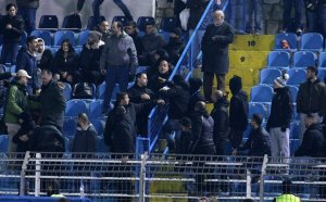 Η πρώτη πρόκληση ήρθε λίγο πριν από το τελευταίο σφύριγμα όταν για ανεξήγητη αιτία μία κροτίδα κρότου - λάμψης έσκασε - προερχόμενη εκτός γηπέδου - στην απέναντι πλευρά από τα επίσημα.