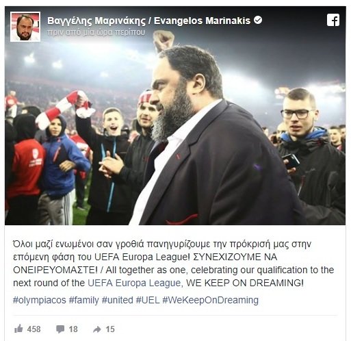 «Όλοι μαζί ενωμένοι σαν γροθιά πανηγυρίζουμε την πρόκρισή μας στην επόμενη φάση του UEFA Europa League! ΣΥΝΕΧΙΖΟΥΜΕ ΝΑ ΟΝΕΙΡΕΥΟΜΑΣΤΕ!», έγραψε χαρακτηριστικά ο ηγέτης των «ερυθρολεύκων».