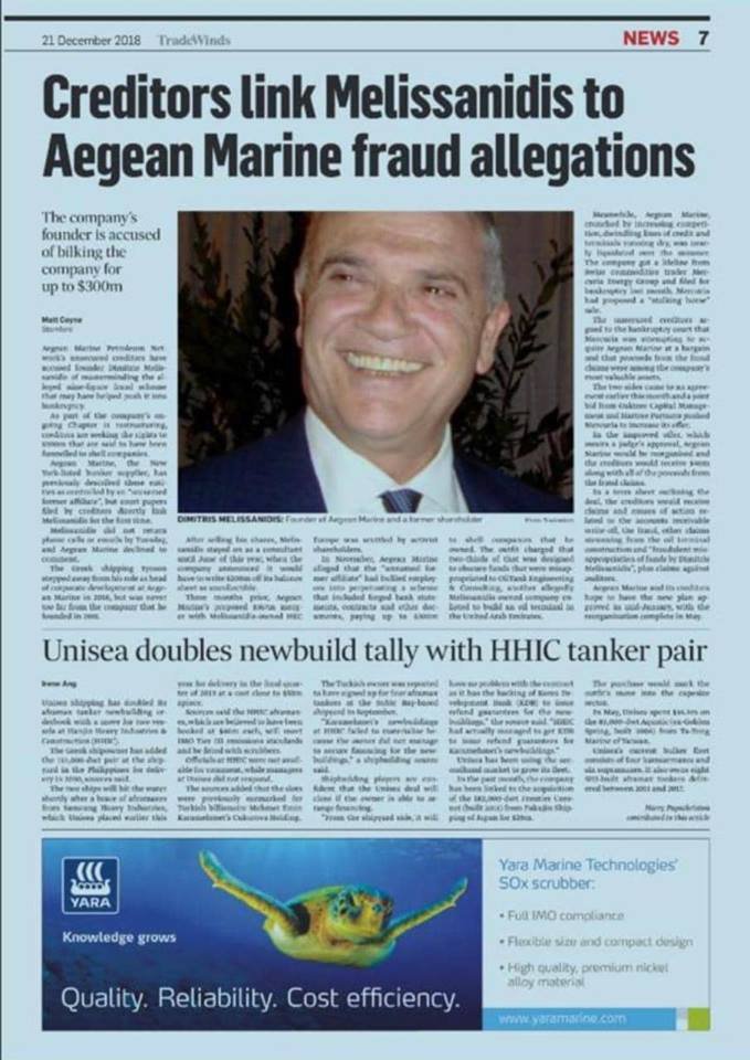 Το δημοσίευμα της ναυτιλιακής εφημερίδας την Παρασκευή (21/12) έχει τίτλο «Οι πιστωτές συνδέουν τον Μελισσανίδη με τις κατηγορίες για απάτη στην Aegean Marine» και σημειώνει ότι εξαπάτησε την εταιρεία που έχασε μέχρι και 300 εκατομμύρια ευρώ.