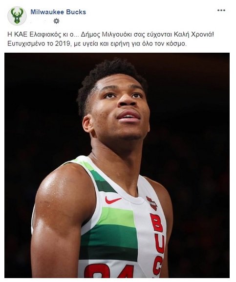 Αναλυτικά η ανάρτησή τους σε άπταιστα ελληνικά: «Η ΚΑΕ Ελαφιακός κι ο... Δήμος Μιλγουόκι σας εύχονται Καλή Χρονιά! Ευτυχισμένο το 2019, με υγεία και ειρήνη για όλο τον κόσμο», αναφέρει το μήνυμα των Μπακς».
