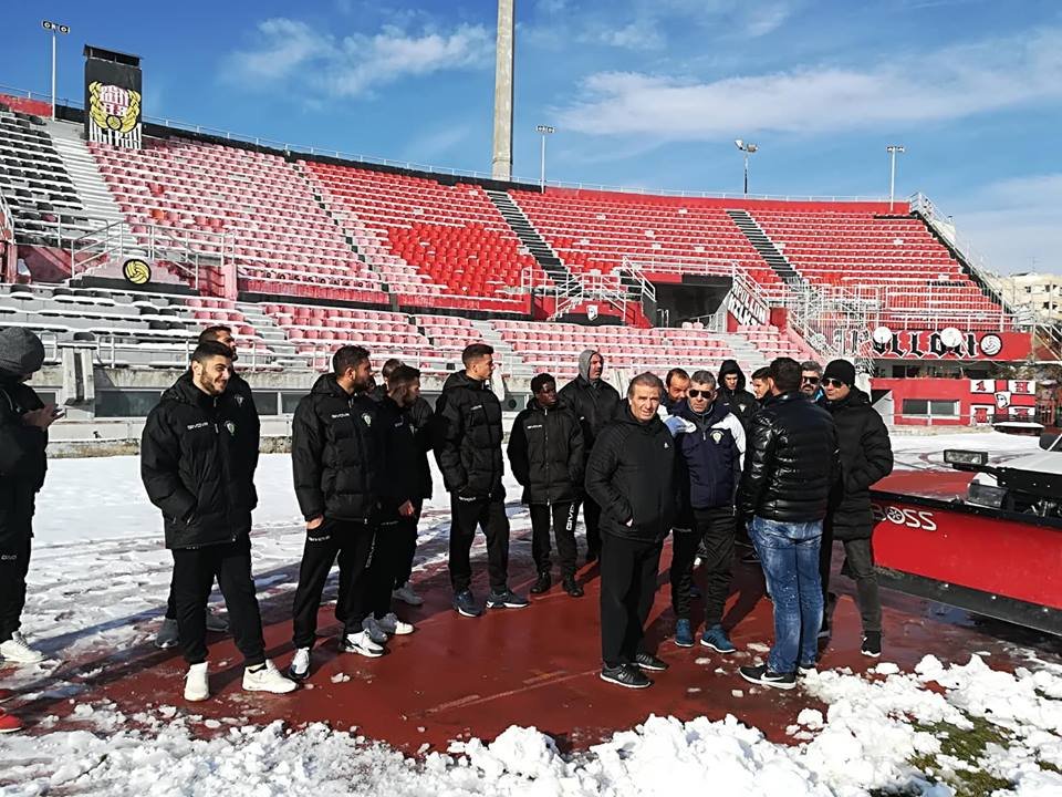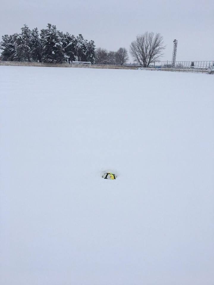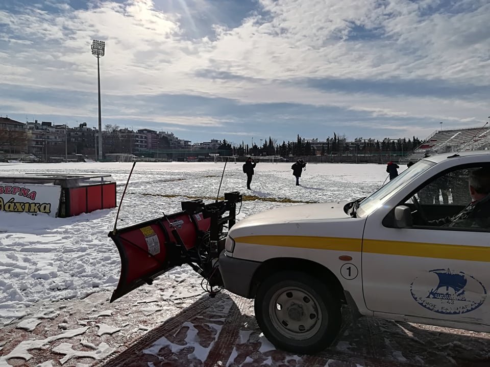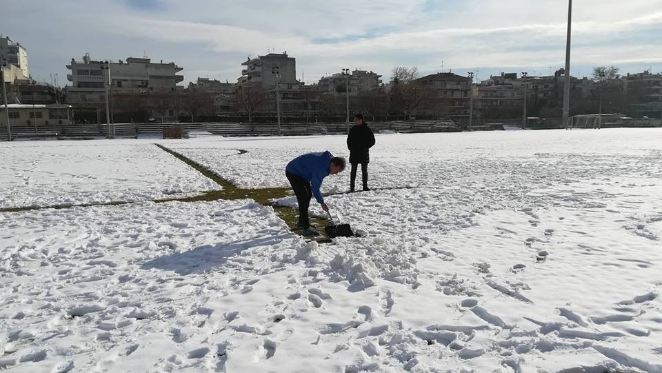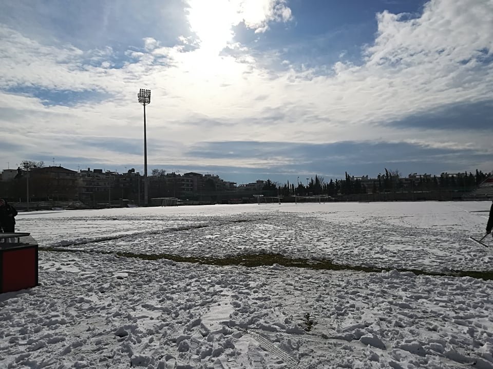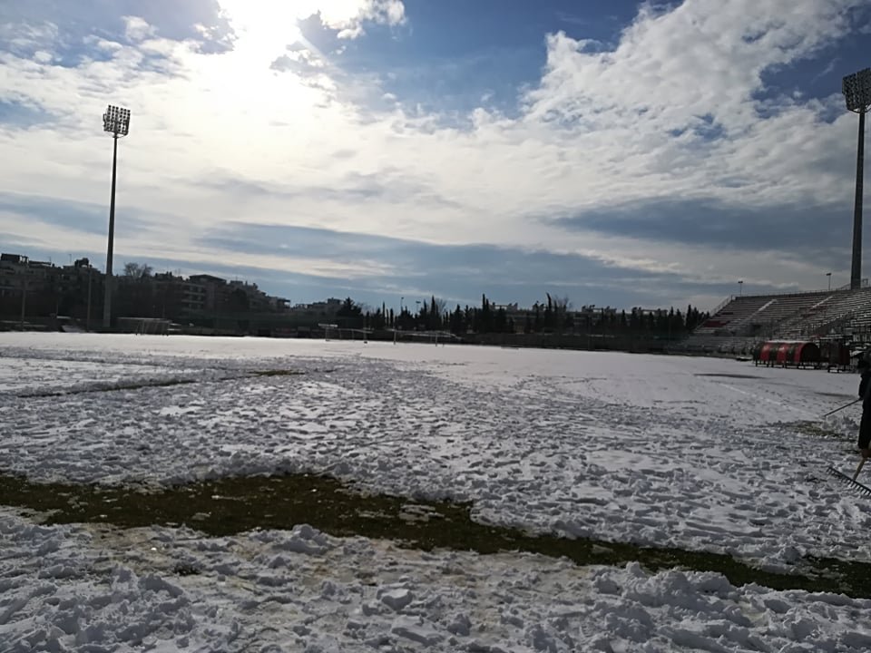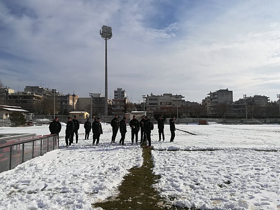 Η εικόνα από το γήπεδο της Καλαμαριάς δεν είναι ενθαρρυντική, αφού, λόγω της κακοκαιρίας, είναι καλυμμένο με χιόνι.