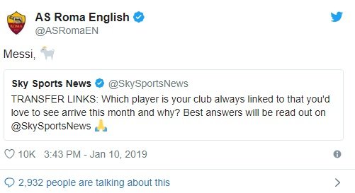 Οι «τζαλορόσι» έκαναν retweet το εν λόγω τιτίβισμα και έγραψαν από πάνω τη λέξη «Μέσι» βάζοντας και το σηματάκι του GOAT (αυτό μπαίνει στους κορυφαίους όλων των εποχών).