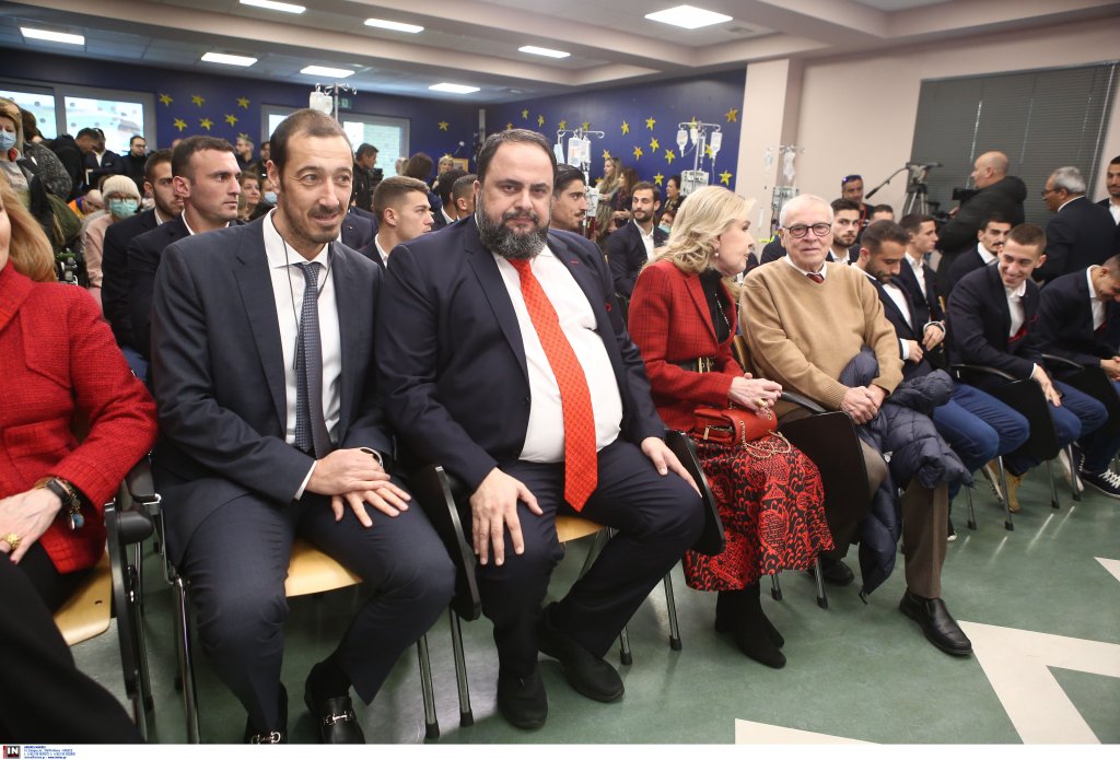 Αξιότιμε κύριε Πρόεδρε, αξιότιμε κύριε Δήμαρχε, αξιότιμε κύριε Θεοδωρίδη, αγαπημένη μου φίλη Ειρήνη (κα. Ειρήνη Νταϊφά), αγαπημένα μου παιδιά, όλα τα μέλη του Ολυμπιακού που είστε σήμερα εδώ… Η επίσκεψη του Ολυμπιακού στο νοσοκομείο μας έχει γίνει πια θεσμός. Γιατί για εμάς, στην αρχή κάθε χρονιάς, όχι μόνο εμείς οι μεγάλοι, αλλά και τα παιδιά σας περιμένουμε με πάρα πολύ μεγάλη ανυπομονησία να μας έρθετε. Όπως βλέπετε, ποτέ άλλοτε δεν έχουν έρθει τόσα πολλά παιδιά, όσα σήμερα, για να θαυμάσουν τους ήρωές τους. Ακόμα κι ο μικρός Χρήστος που καθόταν στην αγκαλιά μου, πριν από λίγο, έλεγε ότι είναι φανατικός Ολυμπιακός για 4,5 χρόνια, γιατί είναι λίγο μεγαλύτερος. Πάντα, είπε, θα είναι Ολυμπιακός.