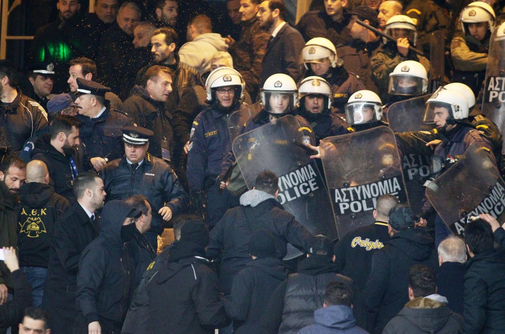 «Ώρα 21.30 μετά την λήξη του αγώνα, 100 φίλαθλοι της ΑΕΚ με καλυμμένα πρόσωπα με κουκούλες επιτέθηκαν σε βάρος αστυνομικών στον χώρο στάθμευσης του κλειστού γηπέδου του ΟΑΚΑ με πέτρες. Αντίδραση Αστυνομίας: -».