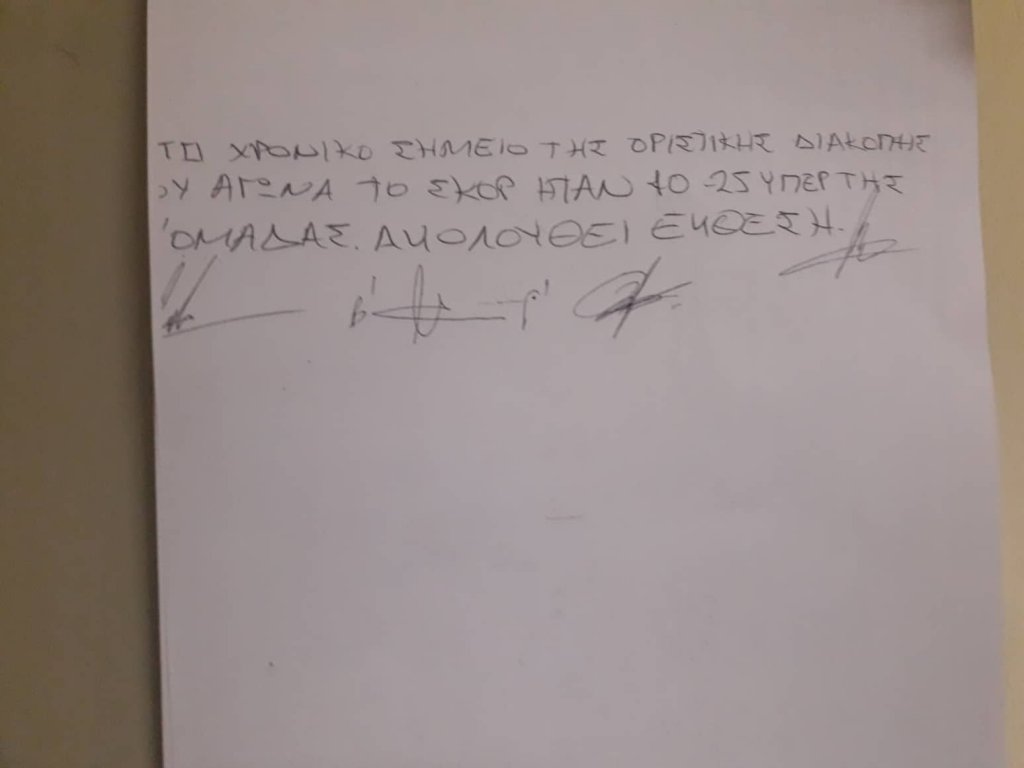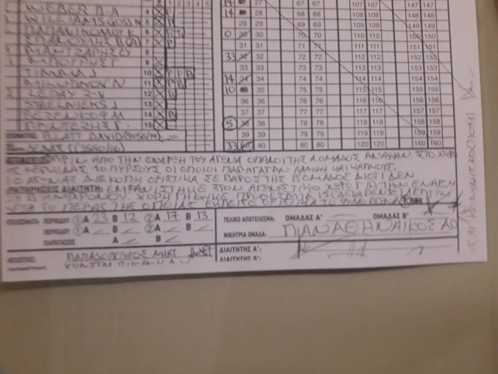 Σε αυτό το διαιτητικό τρίο των Αναστόπουλου, Μάνου και Παναγιώτου αναφέρει ότι «ο αγώνας διεκόπη οριστικά σε βάρος της β' ομάδας, η οποία δεν εμφανίστηκε στον αγωνιστικό χώρο για την έναρξη δευτέρου ημιχρόννου. Δόθηκε προθεσμία 15 λεπτών και μετά το πέρας της έκλεισε το φύλλο».