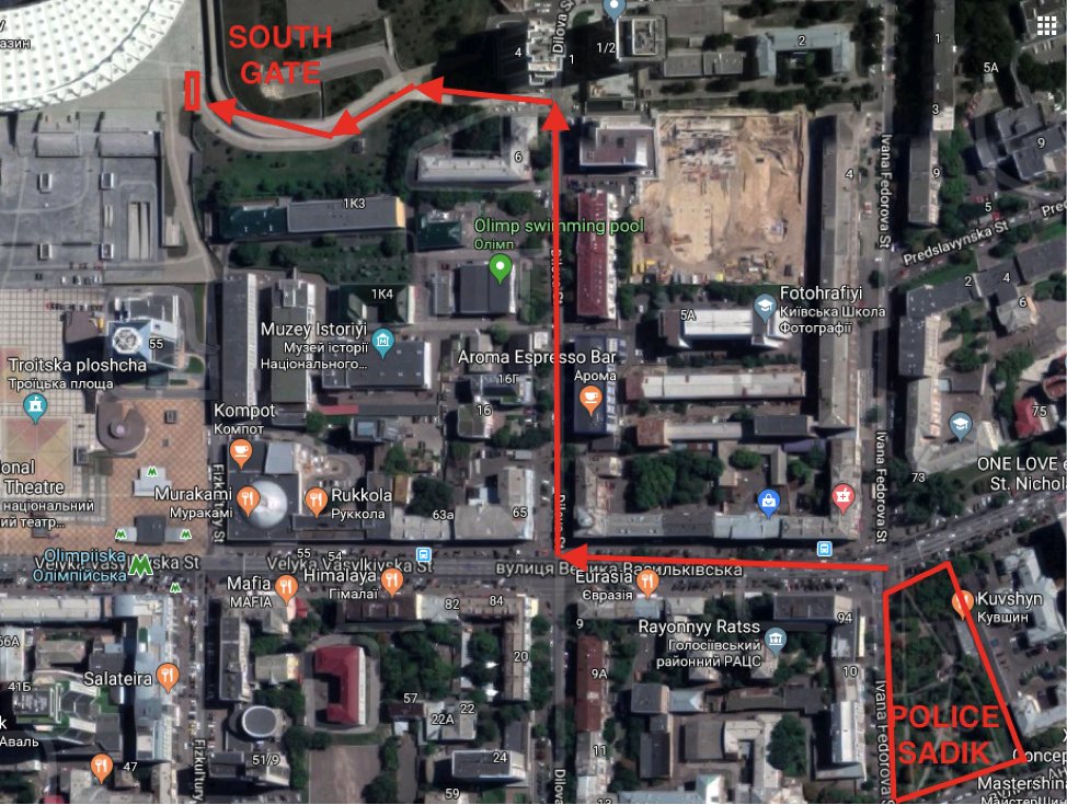 18. Για λόγους ασφαλείας, η Αστυνομία θα ορίσει ως σημείο συνάντησης το Police Sadik (οδός Ivana Fedorova 10; GPS 50.42755127 30.51457024) – βλ. χάρτη παρακάτω