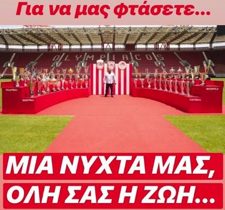 «Θέλετε 1925 ζωές για να μας φτάσετε. Μία νύχτα μας, όλη σας η ζωή», έγραψε στην λεζάντα ο διευθυντής επικοινωνίας της «ερυθρόλευκης» ΠΑΕ στην εικόνα, που ανέβασε στον προσωπικό του λογαριασμό στο Instagram με τον μεγαλόμετοχο της ομάδας να ποζάρει ανάμεσα σε δεκάδες τρόπαια.