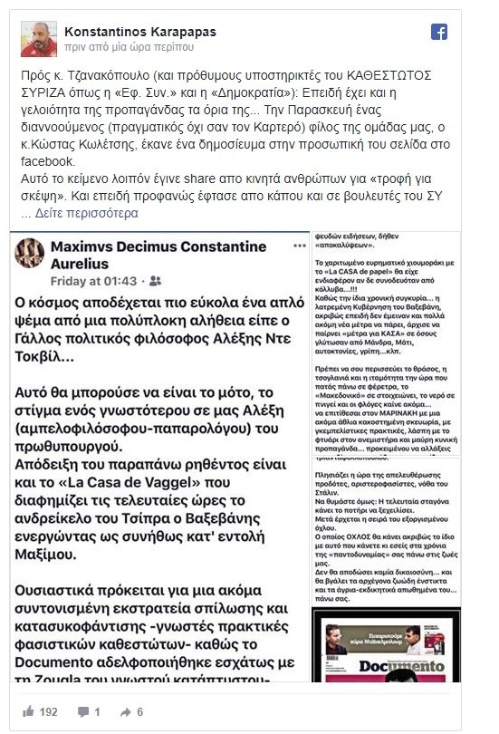 Αναλυτικά η ανάρτηση του Κώστα Καραπαπά: «Προς κ. Τζανακόπουλο (και πρόθυμους υποστηρικτές του ΚΑΘΕΣΤΩΤΟΣ ΣΥΡΙΖΑ όπως η “Εφ. Συν.” και η “Δημοκρατία”): Επειδή έχει και η γελοιότητα της προπαγάνδας τα όρια της... Την Παρασκευή ένας διανοούμενος (πραγματικός όχι σαν τον Καρτερό) φίλος της ομάδας μας, ο κ. Κώστας Κωλέτσης, έκανε ένα δημοσίευμα στην προσωπική του σελίδα στο facebook.