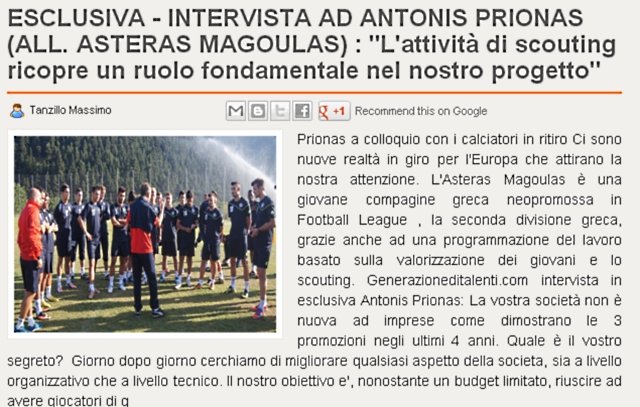 Κι όμως, τα επιτεύγματα του Αντώνη Πριόνα με τον Αστέρα Μαγούλας κέντρισαν το ενδιαφέρον των Ιταλών κι έτσι ο Ευβοιώτης κόουτς παραχώρησε συνέντευξη στην ιστοσελίδα Generazioneditalenti.com.
