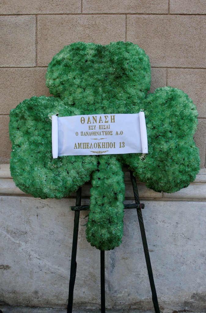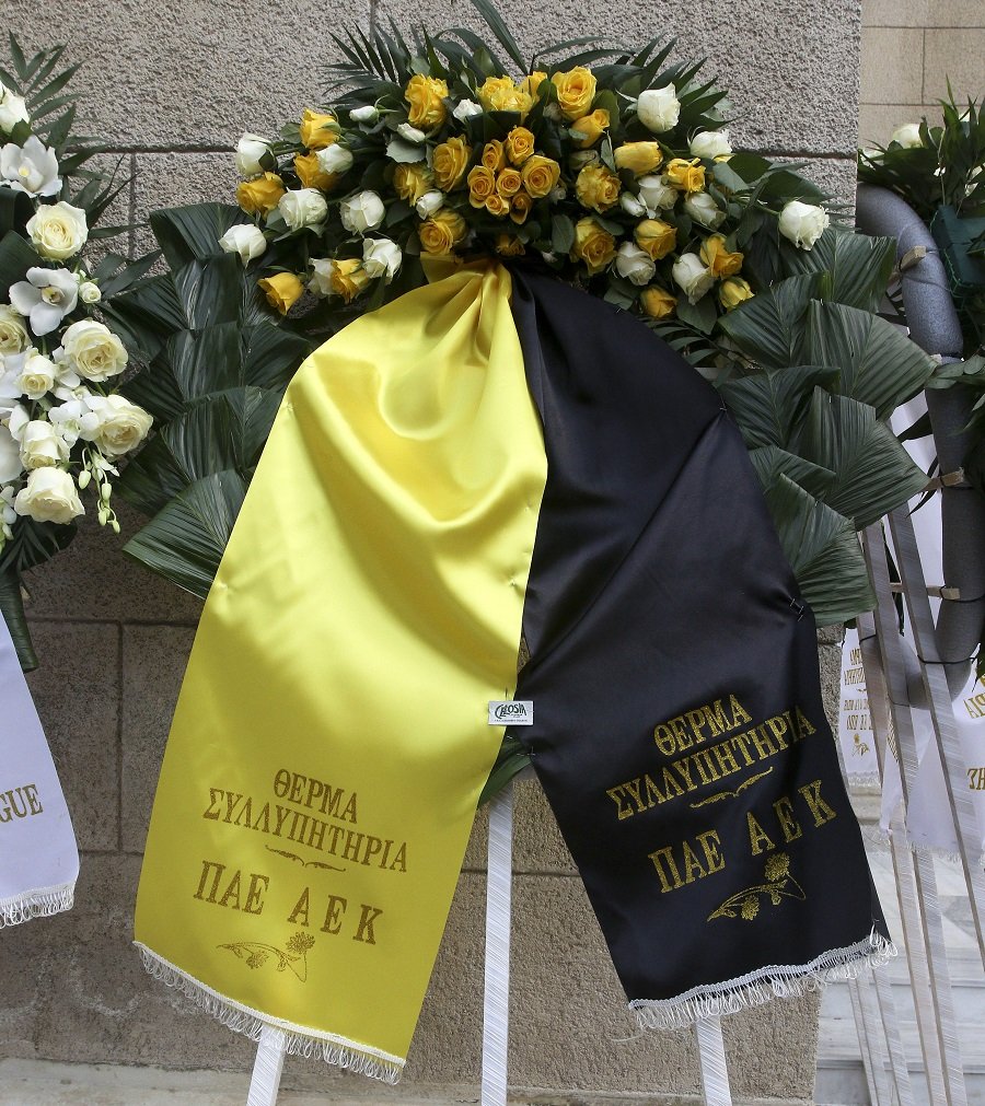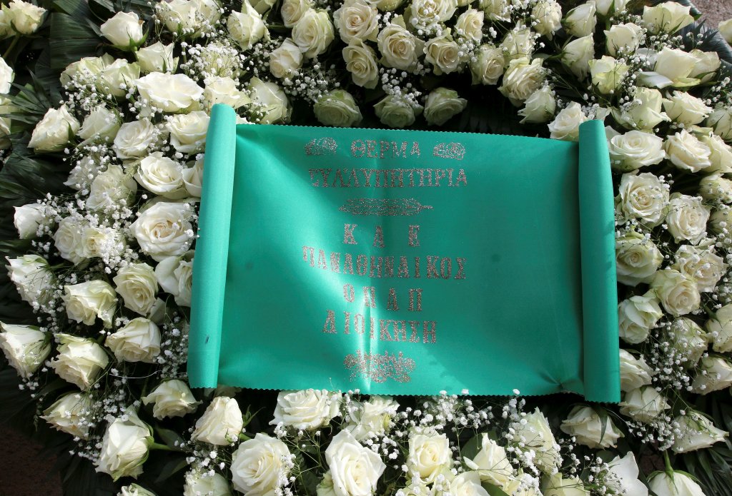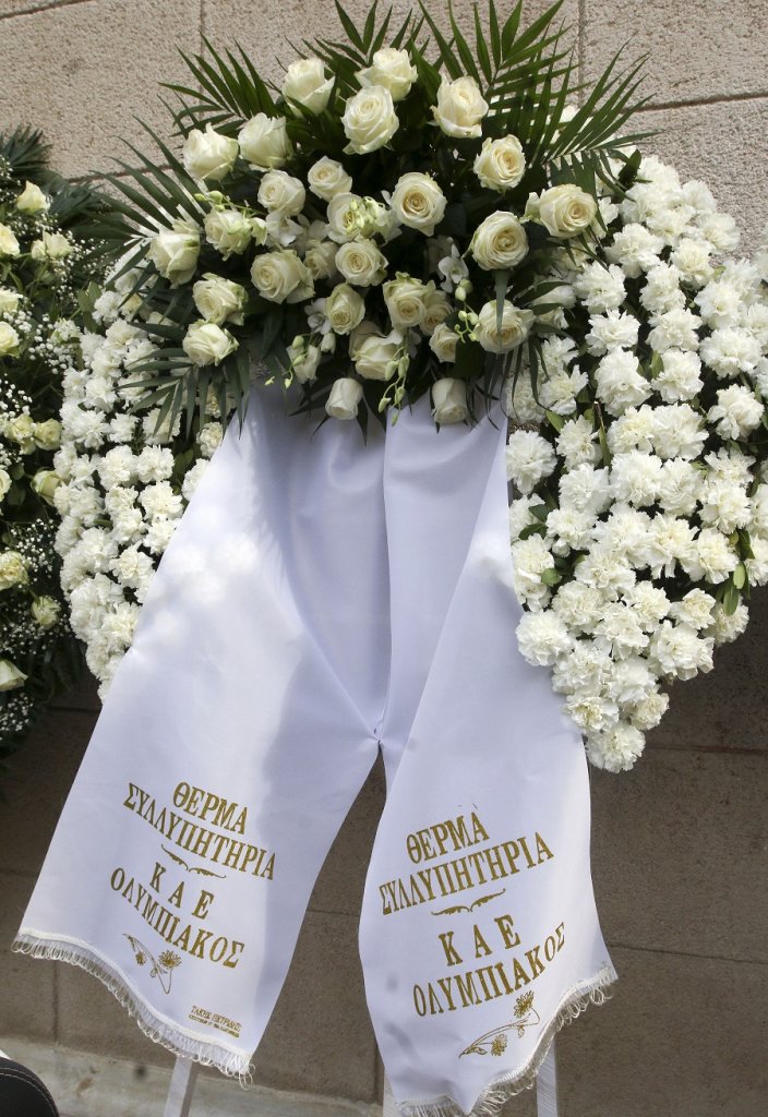 Από νωρίς έφτασαν αμέτρητα στεφάνια, φυσικά από όλα τα τμήματα του Παναθηναϊκού, τον ανιψιό του, Δημήτρη Γιαννακόπουλο, αλλά και από την ΚΑΕ Ολυμπιακός, τον Βασίλη Σπανούλη, τον Πέτρο Κόκκαλη, τον Δημήτρη Μελισσανίδη, την ΠΑΕ ΑΕΚ, τον Μάκη Αγγελόπουλο, την ΕΠΟ, τη Σούπερ Λίγκα και πολλούς άλλους.