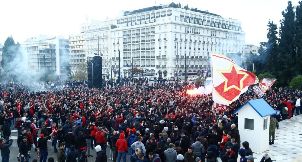 Κοινά συνθήματα, ουκ ολίγα καπνογόνα άναψαν οι φίλοι των Πειραιωτών και των Σέρβων και η ατμόσφαιρα ήταν αν μη τι άλλο εντυπωσιακή, κάτι που προφανώς θα συνεχιστεί και στο φαληρικό γήπεδο.