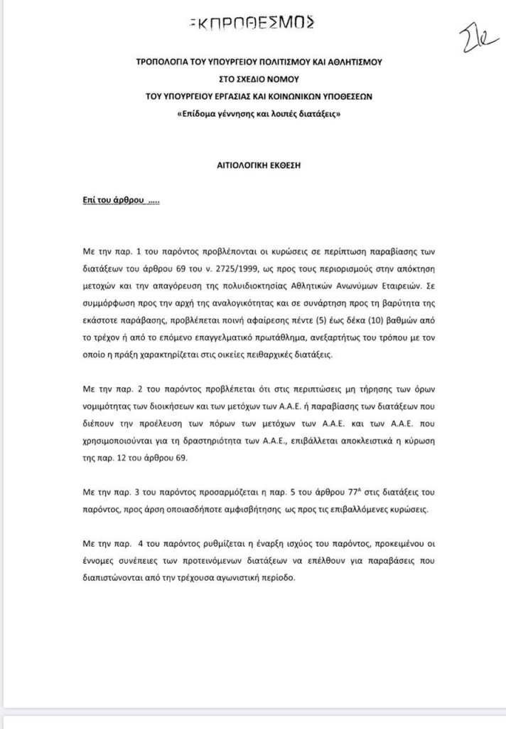 Το κυβερνητικό τρικ, λοιπόν, περιλαμβάνει οριστικά ποινή αφαίρεσης βαθμών, από 5 έως 10 συγκεκριμένα, με την τροπολογία να έχει αναδρομική ισχύ από την 1η Ιουλίου του 2019 και αναφέρεται χαρακτηριστικά ότι: «1. Η παρ. 12 του άρθρου 69 του ν. 2725/1999 (Α' 121) αντικαθίσταται ως εξής: Σε περίπτωση κατά την οποία παραβιασθεί κάποια από τις διατάξεις των προηγούμενων παραγράφων του άρθρου αυτού με υπαιτιότητα οργάνων της ΑΑΕ επιβάλλεται στην ομάδα της, με απόφαση του οικείου δικαιοδοτικού οργάνου, το οποίο επιλαμβάνεται ύστερα από έκθεση της ΕΕΑ ή μετά από προσφυγή όποιου έχει ένομμο συμφέρον, η ποινή της αφαίρεσης 5-10 βαθμών από το τρέχον πρωτάθλημα στο οποίο αυτή συμμετέχει, αναλόγως της βαρύτητας της απόφασης.