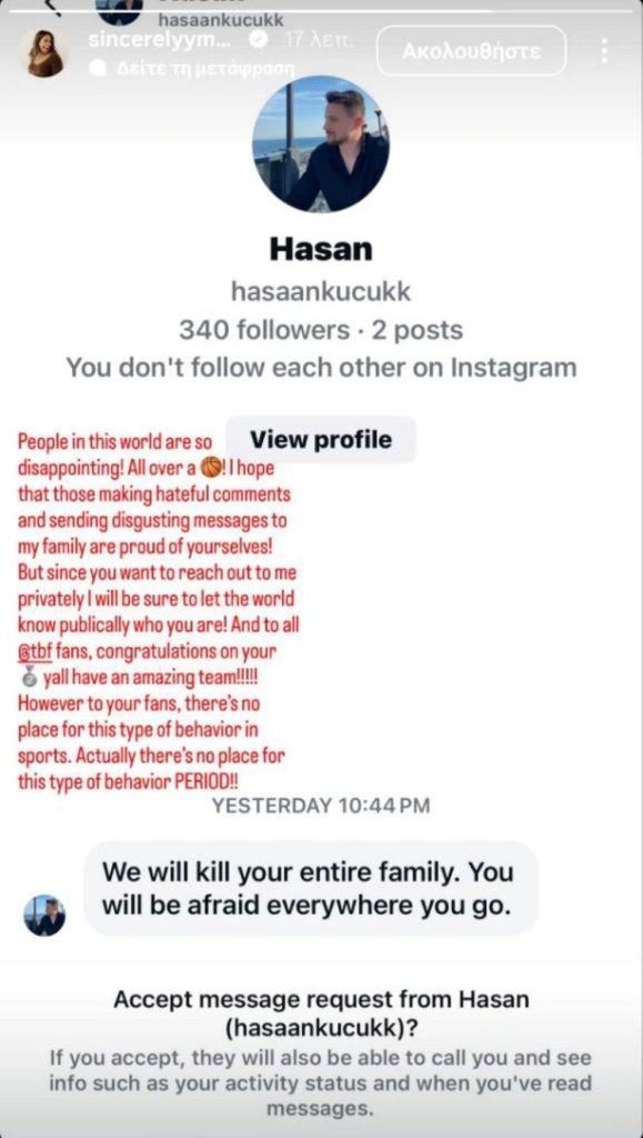 Η Μαράια Αντετοκούνμπο, πόσταρε την Τρίτη (16/9), λίγες ώρες μετά την επιστροφή των διεθνών από τη Ρίγα, ένα story (ΦΩΤΟ 2) στο οποίο υπήρχε απειλητικό μήνυμα με χυδαίες εκφράσεις όπως «θα σκοτώσουμε όλη την οικογένειά σου και θα φοβάσαι όπου και αν πας…».