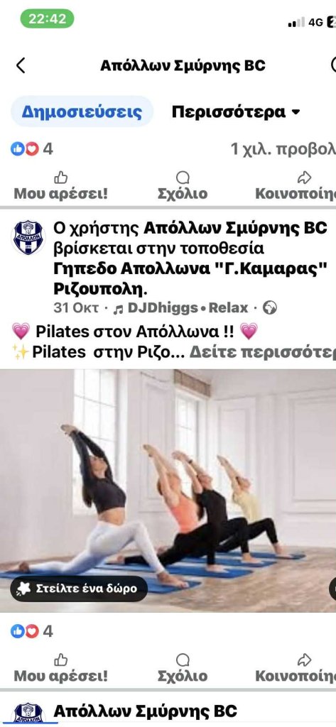 Είναι αδιανόητο, αλλά είναι αληθινό… Μας το είπαν, το θεωρήσαμε μπλακ χιούμορ, αλλά δυστυχώς είναι πραγματικότητα. Τα ξεφτιλίκια στον ιστορικό Απόλλωνα Σμύρνης δεν έχουν τελειωμό. Έτσι μπροστά στο εμπόριο δεν υπάρχουν ηθικοί φραγμοί. Στον Ερασιτέχνη έχουν φτιάξει τμήμα pilates, ναι σωστά διαβάζετε… Χωρίς δείγμα ντροπής το λένε «Απόλλων pilates», το διαφημίζουν στα social media μάλιστα και η μηνιαία συνδρομή κοστίζει 40 ευρώ με τα μαθήματα να παραδίδονται στο κλειστό του μπάσκετ!