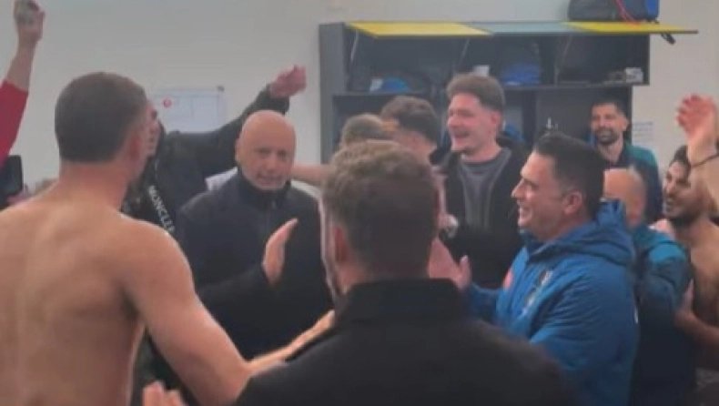 Πάρτι στα αποδυτήρια του «Γηραιού» μετά τη νίκη στην Καρδίτσα που έφερε και την άνοδο στη Σούπερ Λιγκ
