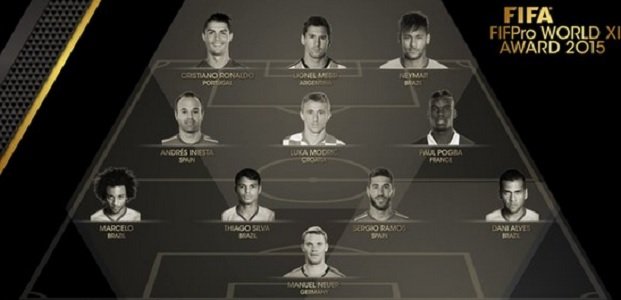 Η κορυφαία ενδεκάδα για το 2015 ανακοινώθηκε κατά τη διάρκεια του γκαλά της ΦΙΦΑ για τον κορυφαίο ποδοσφαιριστή της χρονιάς που πέρασε τη Δευτέρα (11/1).